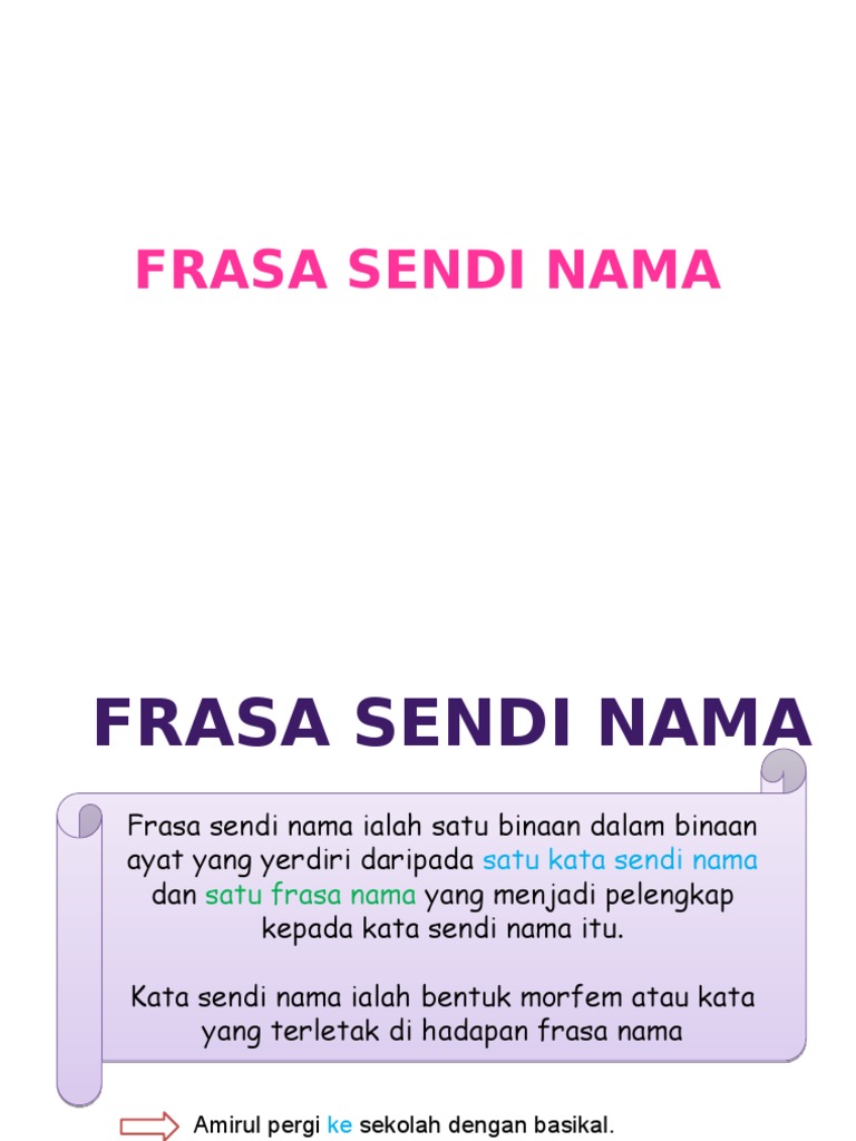Frasa sendi nama boleh dibentuk melalui empat cara. Kata Ganti NamaFrasa Sendi Nama. Pendepanan frasa sendi nama Frasa sendi nama sebagai predikat.